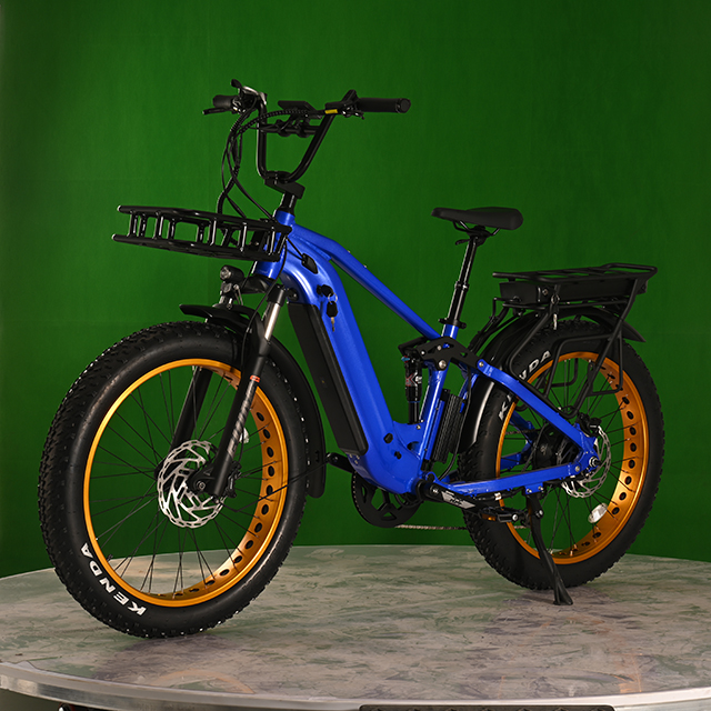 This is a full suspension fat tire electric bike, perfect for all terrains—mountain trails, snow, sand, gravel, and urban roads.